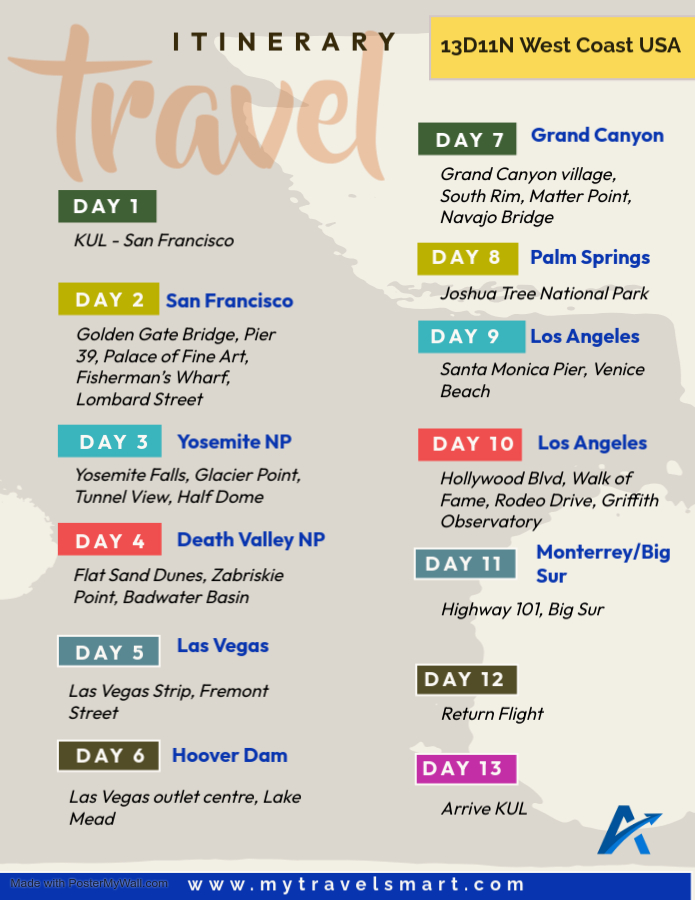 - Pakej ke West Coast USA yang paling komprehensif dengan memaksima perjalanan anda selama 13 hari dengan sekurang-kurangnya ke 15 tempat-tempat menarik;